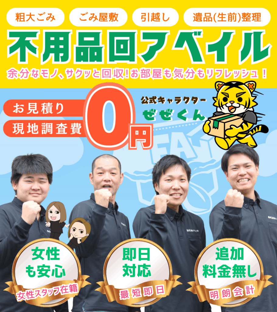 不用品回収アベイルは、迅速に現場へ伺い、回収品の量や種類を問わず、お客様のご要望に沿って丁寧に回収いたします。