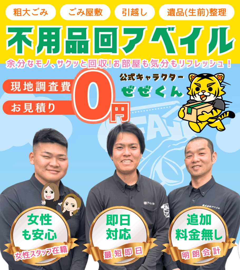 作業はすべて不用品回収アベイルの自社スタッフが担当。不用品や粗大ごみの回収はもちろん、引越しやハウスクリーニングまで、スピーディかつ丁寧に対応いたします。