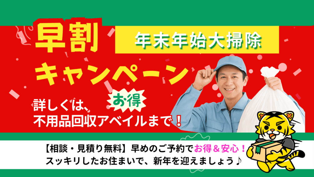 【今月のオススメ】早めのご予約でお得&安心!早割キャンペーン! 2025 10/27 お知らせ 2025年10月27日 今月のオススメ 年末年始のご予約でお得な割引が受けられる 現地調査・お見積りはもちろん無料 年内・年始もスピーディーに対応 家族みんなで安心して新年を迎えられるサポート こんな方におすすめ 年末の大掃除で片付けが間に合わない方 引っ越しや模様替えで大量の不用品が出る方 スッキリした気持ちで新年を迎えたい方 早めのご予約で安心&お得 年末年始は予約が集中しやすいため、早めにご相談いただくとスムーズに対応可能です。 さらに、早期予約でキャンペーン割引が適用されるため、費用もお得に。 「年末年始を快適に過ごしたい」方にはピッタリのサービスです。 お問い合わせ・ご予約はこちら 詳しくは、不用品回収アベイルまでご相談ください。 現地調査・お見積りは無料です! 年末年始大掃除のチャンスを逃さず、スッキリしたお住まいで新年を迎えましょう。 早めのご予約でお得&安心のキャンペーンをぜひご活用ください! お知らせ URLをコピーしました! 9/30まで 【おともだち紹介サマーキャンペーン】3千円QUOカードプレゼント! 関連記事 9/30まで 【おともだち紹介サマーキャンペーン】3千円QUOカードプレゼント! 2025年8月29日 “遺品整理の相談所”との業務提携のお知らせ 2025年8月20日 【今月のオススメ】敬老の日「実家の片付け」相談会 2025年8月20日 【今月のオススメ】お盆前後の「実家片付け」で親孝行しませんか? 2025年8月7日 【今月のおすすめ】夏休み断捨離応援! 2025年7月14日